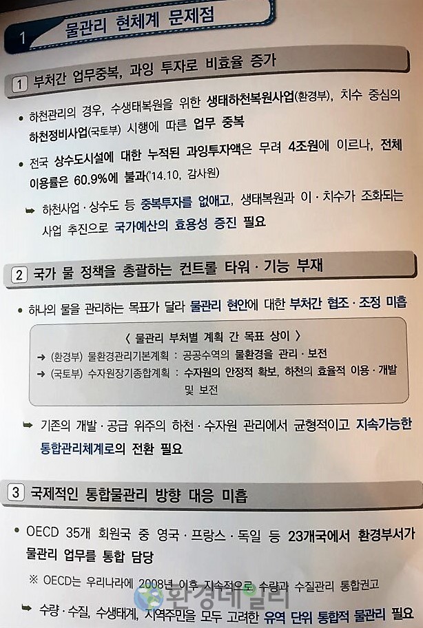| ▲사실상 환경부에서 통합물관리 업무가 넘어오면서 환경부 조직내에서 조직을 새롭게 짜는데 부산한 움직임을 보 이고 있다. 이날 환경부가 배포한 자료에서도 물관리 현체계 문제점을 언급하면서 그동안 국토교통부가 추진해온 물정책에 대한 맹점을 우회적으로 수정돼야 한다는 입장을 공개적으로 냈다. |