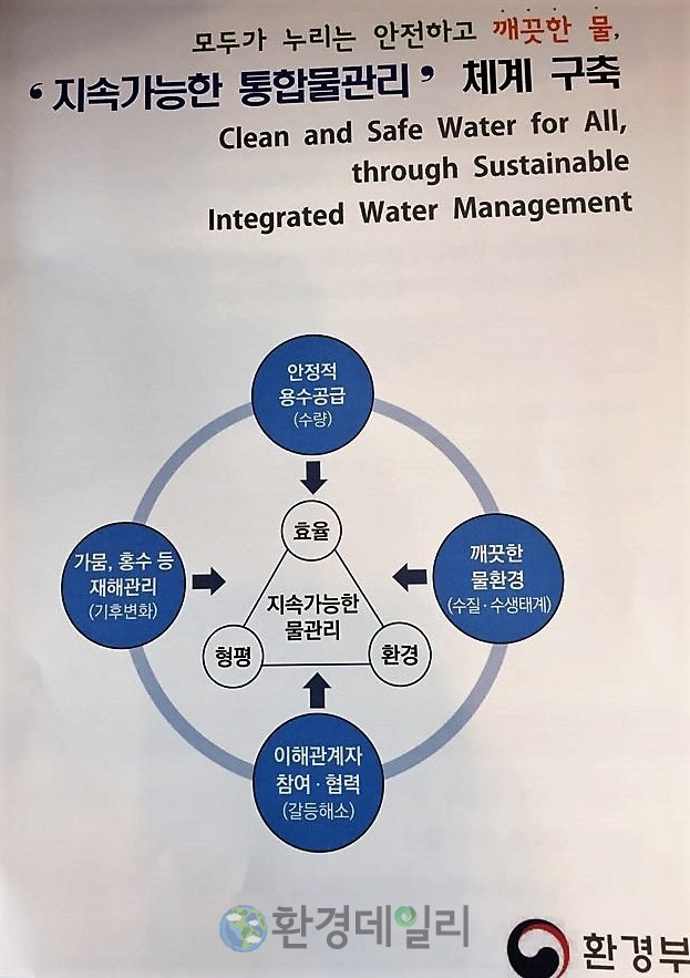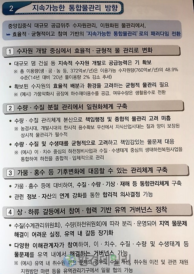 | ▲환경부는 지속가능한 통합물관리 방향을 균형잡힌 물관리로 가뭄해소와 홍수예방, 물때문에 반복적인 갈등을 해결할 키워드로 각 한강, 금강, 낙동강, 영산강 유역별로 거버넌스를 정착해 지역민들에게 혜택을 둘려줄 수 있도록 하겠다고 밝혔다. |