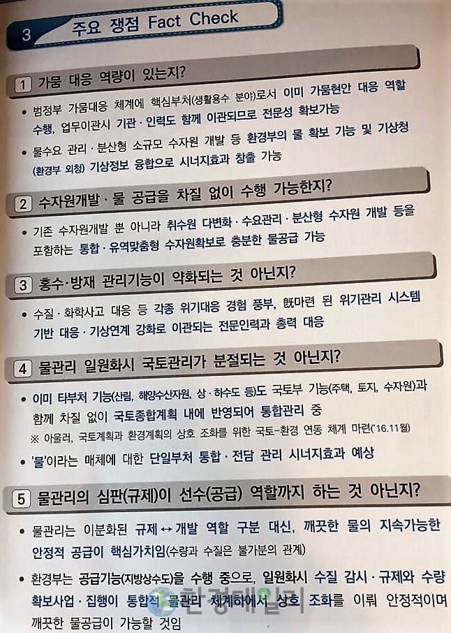 이날 환경부는 토론회장에서 지속가능한 통합물과리 체계 구축이라는 3페이지 분량의 ▲물관리 현체계 문제점 ▲지속가능한 통합물관리 방향 ▲주요 쟁점 팩크체크 카테고리로 유인물을 배포해 주목을 받았다.