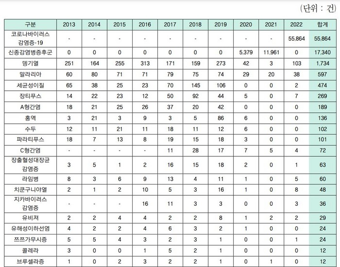 2013년부터 코로나 이전 19년까지 평균 533건으로 매년 꾸준히 증가해왔다. 최근 3년은 코로나 영향으로 인해 대폭 증가해 7만3524건이다. 감염병별로는 1위는 코로나 7만3204건으로 뒤를 이어 뎅기열 1734건, 말라리아 597건, 세균성이질 474건, 장티푸스 269건 순이다.