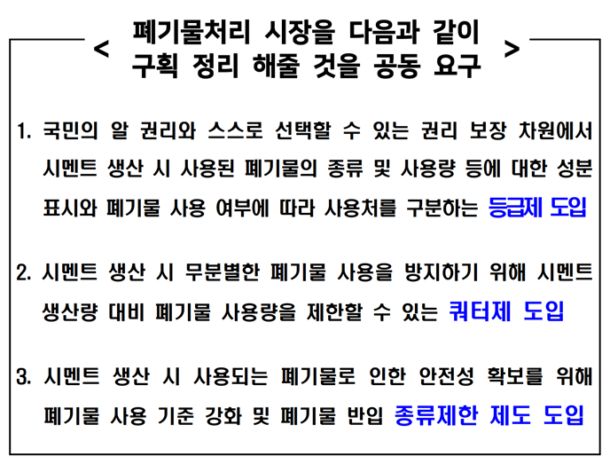 생대위는 심각한 자원순환 정책을 무용지물로 만든 시멘트 업계에 대해 ▲시멘트 제품 등급제 도입 ▲시멘트 생산량 대비 폐기물 사용량 제한 쿼터제 관리 ▲무분별한 폐기물 반입‧처리 방지 차원 폐기물 종류 제한을 요구했다.