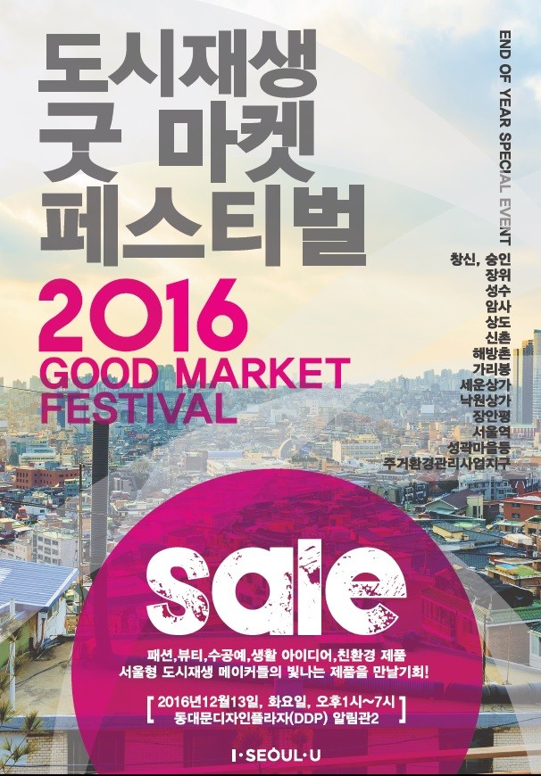 성수동, 해방촌, 장안평 등 24개 도시재생지역에서 생산하거나 지역경제와 직결된 상품에 대한 전시 판매부터 전문적인 마케팅 상담과 교육까지 총 망라하는 첫 번째 공동마켓 '도시재생 굿 마켓(Good Market) 페스티벌'이 13일 13시부터 동대문디자인플라자(DDP) 알림2관에서 열린다.