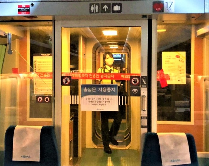 ▲마치 영화 부산행 한 장면을 연상케 하는 코로나열차가 된 KTX, 해외에서 들어온 승객들을 따로 마련된 객실내는 격리된 채 운행했다.사진 김영민 기자 |