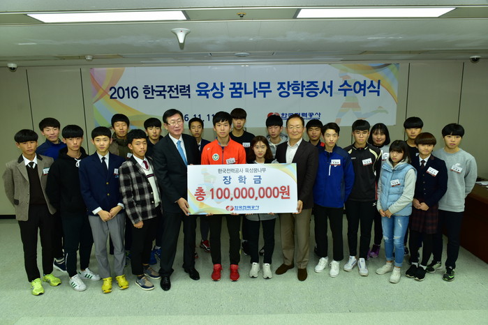 [환경데일리 윤동혁 기자]한국 육상 영광 재현을 위한 한국전력은 11일 오후 3시 한전 아트센터에서 전국의 우수 중고교 육상선수 20명에게 한국 육상의 발전을 위한 장학증서 및 장학금 총 1억원을 전달했다.