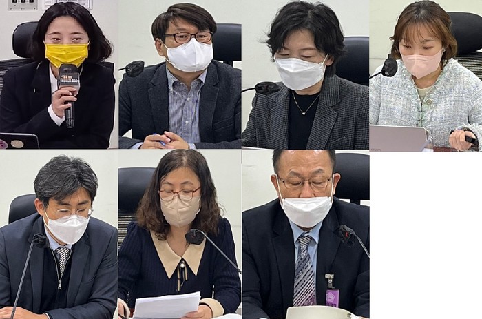 ▲(사진 상단 왼쪽부터 시계방향) 류호정 정의당 의원, 우경선 녹색연합 공동대표, 임성희 녹색연합 팀장, 지현영 지평 변호사, 이성호 에너지전환정책연구소장, 오수산나 전국시민발전협동조합 사무처장, 박강훈 한국에너지공단 팀장 |