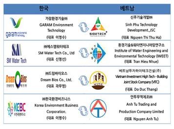 이번 협약을 체결한 기업은 가람환경기술(주), 베트남 Sinh Phu 기술개발(주), (주)드림바이오스, VITC(주), (주)에스엠워터테크, IWEET, (주)한국환경비즈니스, Anh Tu(주)다.