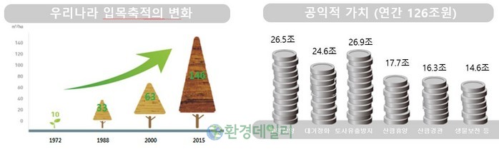 | ▲산림산업 비전이 크게 증가하고 있다. 산림임업인들이 자부심으로 삼고 있는 공익적 가치가 연간 126조원으로 자동차 조선 철강 반도체산업과 동일한 수준으로 국가 5대 기둥으로 평가하고 있다. |