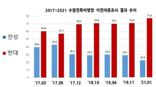국방부가 2017년 2월 화성시 화옹지구를 수원전투비행장 예비이전 후보지로 일방적으로 선정한 이후, 화성시는 총 7차례 여론조사를 진행했다. 2017년 3월에 조사에서 반대 의견이 60.4%였으나, 이후 2017년 11월과 2019년 11월 조사에서 반대 의견이 69.5%, 70.9%로 확인됐다. 이번 여론조사 결과에서 반대 의견이 77.4%로 크게 늘어 화성시민의 '수원전투비행장 화성 이전 반대'의견이 확고해지는 모양새다.