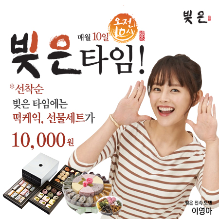 빚은 타임 은 빚은 브랜드 명에서 착안해, 매월 10일 오전 10시부터 빚은 쇼핑몰(www.bizeun.co.kr)에서 다양한 떡 케익과 선물세트를 한정된 수량만큼 1만원에 제공하는 타임 이벤트로 오는 5월 10일부터 매월 진행할 계획이다.
