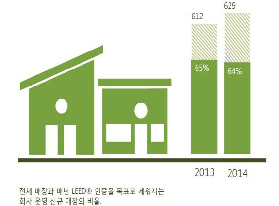 이 보고서 첫 페이지에 실린 첫 사진에는 기존 건물과 다른 컨테이너 매장이다. 바로 스타벅스 디자이너가 설계한 창의적인 접근방식으로 워싱턴 투킬라 매장에서 LEED 인증을 받기 위해 옛 선적 컨테이너를 재사용한 것. 이런 매장은 시카고를 비롯 일리노이, 덴버, 콜로라도에서도 비슷한 매장이 개장했다고 소개했다.