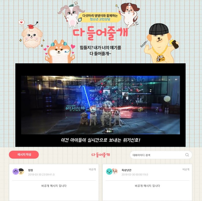 전문 상담사들이 각기 다른 성격을 가진 다섯 마리 개들의 캐릭터가 돼 청소년들의 고민을 들어주고 상담을 진행하는 마이크로 페이지(www.lifedogs.or.kr)를 운영해 약 6200여 명의 청소년들이 방문, 591건의 상담글을 남겼다.