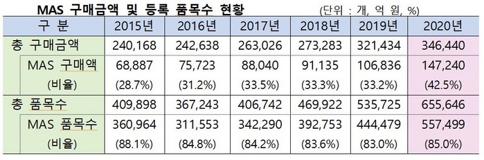 ’18년에 9조1000억 원에서 ’19년) 10조7000억 원, ’20년은 14조7000억 원으로 매년 20% 이상 증가세다. MAS 등록 품목수는 55만7000 개(’20년)로 조달청에 등록된 총 품목 수(65만6000개)의 85.0% 수준이다. 이번에 문제가 된 2020년도 다수공급자계약을 통한 공급금액은 14조7000억 원으로 조달청을 통한 총공급금액(34조6000억 원)의 42.5% 수준이다.