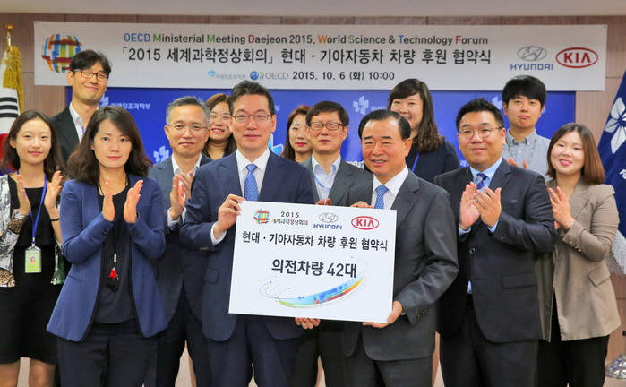 현대기아차는 6일 미래창조과학부 대회의실에서 현대기아차 박광식 부사장, 2015 세계과학정상회의 준비기획단 최영해 단장 등 관계자들이 참석한 가운데 차량 후원 협약식을 가졌다.