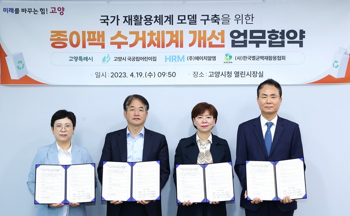 이번 사업을 위해 (사)한국멸균팩재활용협회, ㈜에이치알엠과 19일 고양시청에서 업무협약을 체결했다. 협약은 ▲고양시 재활용 정책 수립 및 참여 홍보 강화 ▲관내 국공립어린이집 소속 어린이집 원아 대상 종이팩 분리배출 환경교육을 하게 된다. 수거업체는 주식회사 에이치알엠이 맡는다.