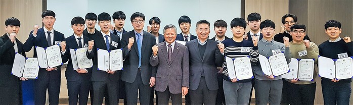 | ▲철강산업인적자원개발협의체(철강 SC)는 18일 오전 부경대 회의실에서 스틸유니버시티 코리아 챌린지 대회 시상식을 개최했다. 12회째를 맞은 이번 대회에서 총 21개 대학 342명이 참가, 부경대 손태혁씨가 대상의 영예를 안았다.(사진 중앙은 이민철 한국철강협회 상근 부회장) |
