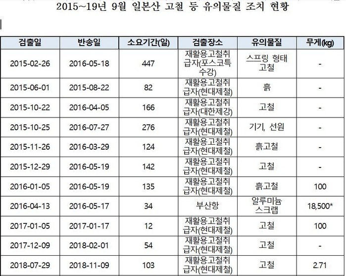 [환경데일리 한영익 기자]방사능 오염 물질을 포함한 일본산 고철 등이 조속히 일본으로 반송돼야 함에도, 길게는 447일 동안 국내 사업장에 보관됐던 것으로 드러났다.