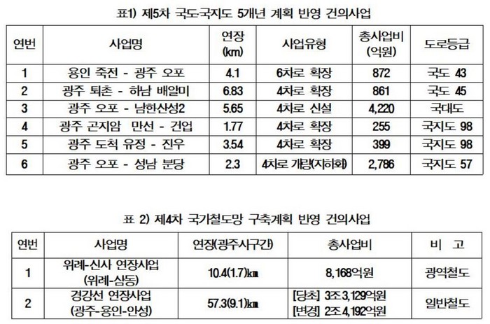 광주시 도로사업 6건 제5차 국도·국지도 5개년 계획' 요청