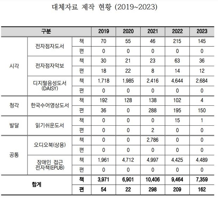 내년 대체자료 제작 계획도 전체 대체자료 제작 건수인 1만4160건 대비 0.78%(111건)에 불과했다.