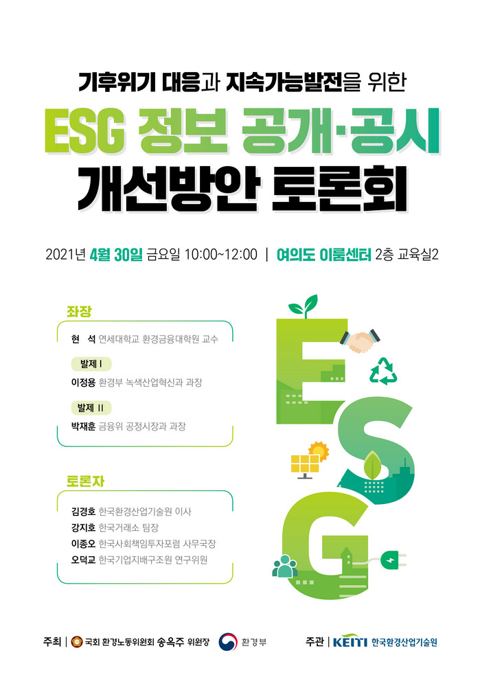 이에 대해, 국회 환노위 송옥주 위원장(경기 화성갑)과 환경부가 공동주최하고 한국환경산업기술원(KEITI)이 주관하는 '기후위기 대응과 지속가능발전을 위한 ESG 정보 공개‧공시 개선방안 토론회'가 30일 오전, 서울 여의도 이룸센터에서 개최된다.