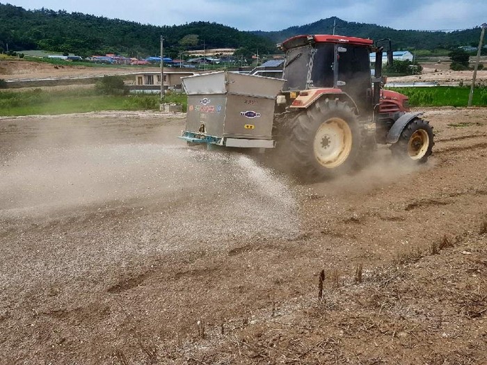 칼슘유황 비료 살포..품질향상 일손해결 '일거양득'