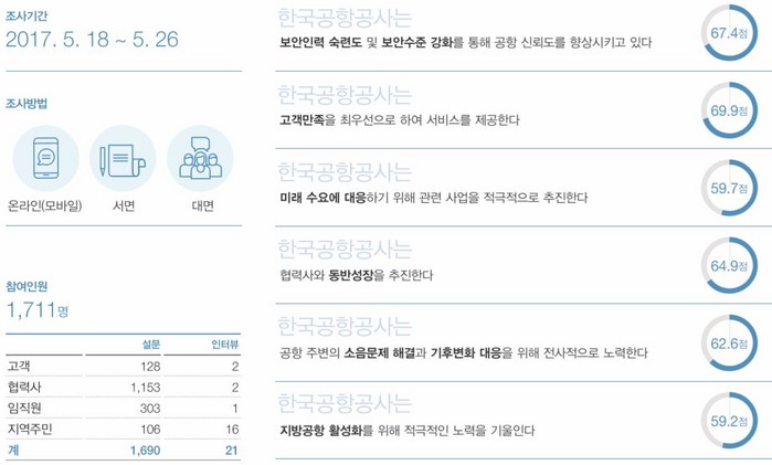 | ▲한국공항공사에 자체 조사한 소음문제해결 등 만족도 내용이다. 2017년 기준 소음은 62.6점이라고 밝혔다. |