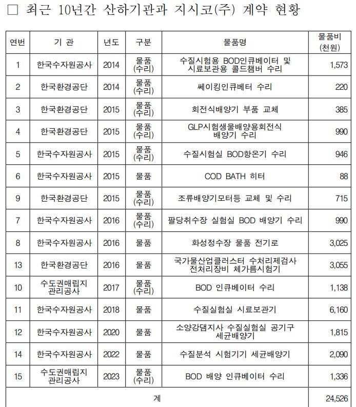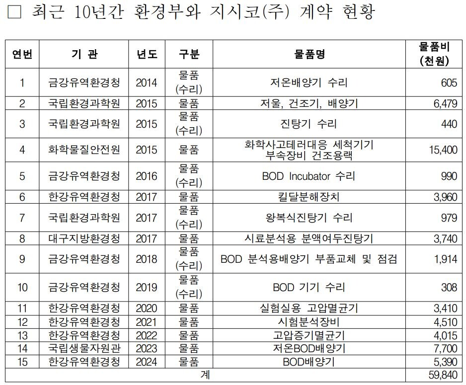 박 의원이 환경부로부터 제출받은 인사청문자료에 따르면 최근 10년간 국립환경과학원 등 환경부 소속기관이 박 후보자의 처가 기업으로 알려진 A사로부터 15건, 총 5900여 만원의 물품을 납품받은 것으로 확인됐다.