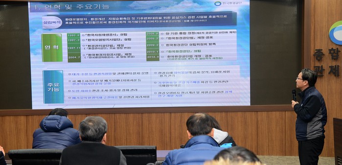 환경공단 사업계획 소개에서 ▲한국환경공단 주요업무현황 ▲노후수도관 관망 개선사업 ▲공중전화부스 활용 전기차 공공급속충전시설설치 업무소개 등이 있었다.