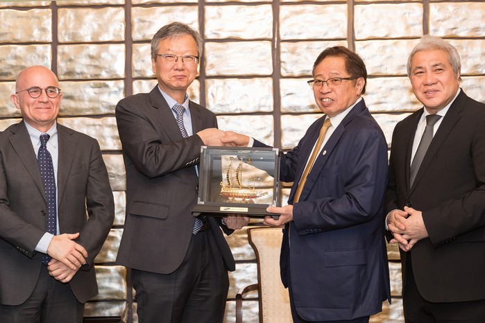 | ▲계약식에서 삼성엔지니어링 최성안 사장(왼쪽에서 두 번째)과 사라왁 州 아방 압둘 라만 조하리 주지사(오른쪽에서 두 번째)가 기념품 교환을 하고 있다. |