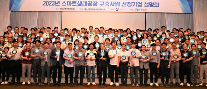 환경부 산하 K-eco 한국환경공단(이사장 안병옥)은 7일 상암동 중소기업DMC타워 에서 '2023년 스마트생태공장 구축사업'에 선정된 98개 기업들이 모였다.