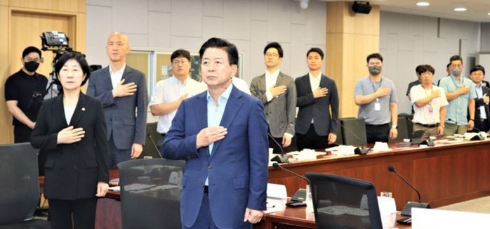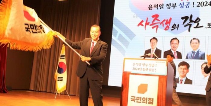 | ▲지난해 8월 19일 홍문표 의원은 충청남도 도당위원장으로 취임해 윤석열 정부 성공을 위해 헌신하겠다고 공헌하며 당기를 들었다. |