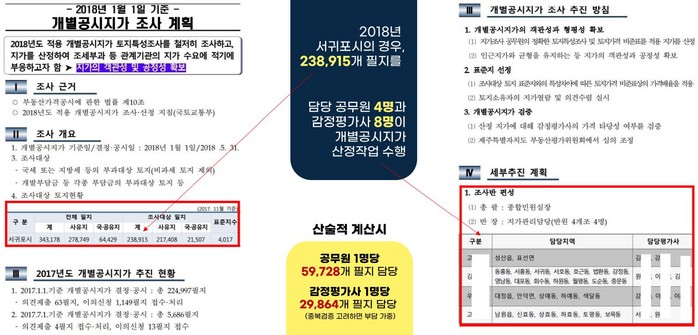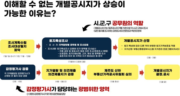 제주도의 개별 공시지가는 제주도 산하의 '부동산가격공시위원회'에 의해 최종 결정됐다. 부동산공인중개사와 감정평가사, 공무원 등으로 구성되는 '공시위원회'는 이해충돌의 여지가 있어 투명성 확보를 위해 시민단체 추천인사가 들어가도록 하나, 명단에는 시민단체 인사는 보기 어려워 투명성에 대한 문제까지 드러나고 있다.