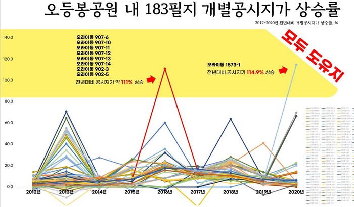 최근 불거진 제주도가 매입한 땅 중 여덟 필지는 2016년 한 해에 전년대비 약 111%, 다른 한 필지는 도정의 토지 매입 이후 공시지가가 114.9% 상승하는 전대미문의 공시지가 상승률을 보였다.