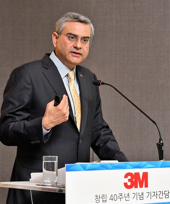 한국쓰리엠이 19일 서울 더플라자호텔에서 창립 40주년 기자간담회에서 아밋 라로야 한국쓰리엠 사장은 먼저 한국 고객과 한국 사회에 감사를 표하며 국내 고객을 위한 노력을 강화하는 성장 비전을 발표했다.