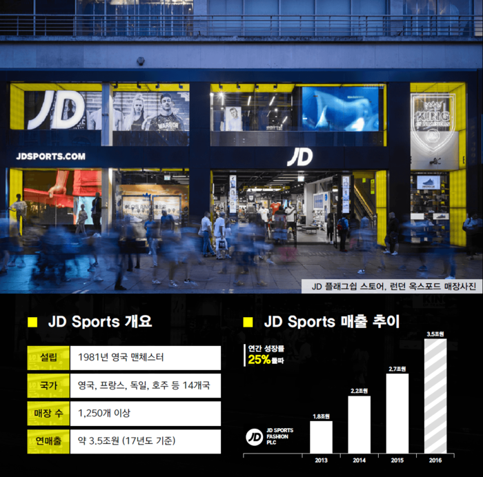 JD는 1981년 영국 맨체스터에서 1호점을 시작으로 현재 프랑스, 독일, 이탈리아, 호주 등 14개 국가, 1250개 이상의 매장 수와 2만5800명의 직원을 보유한 유럽 최대 규모의 멀티숍 기업이다. 특히 평균 GDP 성장률이 1.9%인 유럽 시장에서 매년 25%라는 경이로운 성장률을 기록하며 성공가도를 달리고 있다.