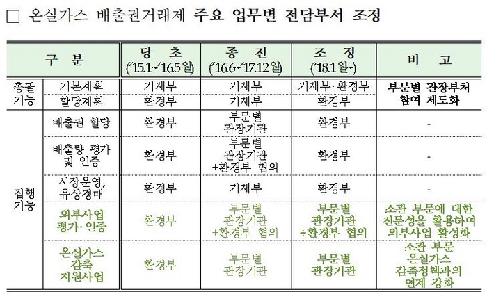 환경부는 지난해 12월 정부의 기후변화 대응체계의 개편 및 이관에 따라 '2030년 국가 온실가스 감축 목표달성을 위한 기본 로드맵'의 수정안을 마련하고, 온실가스 배출권거래제 운영을 총괄하게 됐다.
