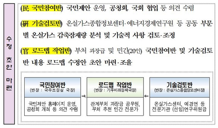환경부는 국무조정실, 기획재정부, 과기부, 외교부, 농림부, 산업부, 국토부, 해수부, 산림청이 참여하는 관계부처와 함께 로드맵의 수정 보완 과정에서 이해관계자 및 국민의 의견을 수렴, 로드맵 수정안을 마련할 계획이다.