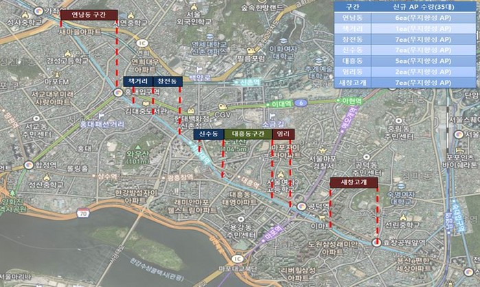 당초 마포구는 올해 서울시민 참여예산 사업으로 홍제천(1.5Km)과 불광천(2.1km) 전역에 공공와이파이 서비스 제공을 위한 자가통신망 구축 사업에 나섰다. 이후 보다 많은 구민에게 무료 와이파이 서비스를 제공하기 위해 서울시와 협의한 결과 지난 10월 말 마포구의 경의선숲길공원 전 구간(4.5km)을 서비스 지역에 포함, 확대하기로 결정했다.