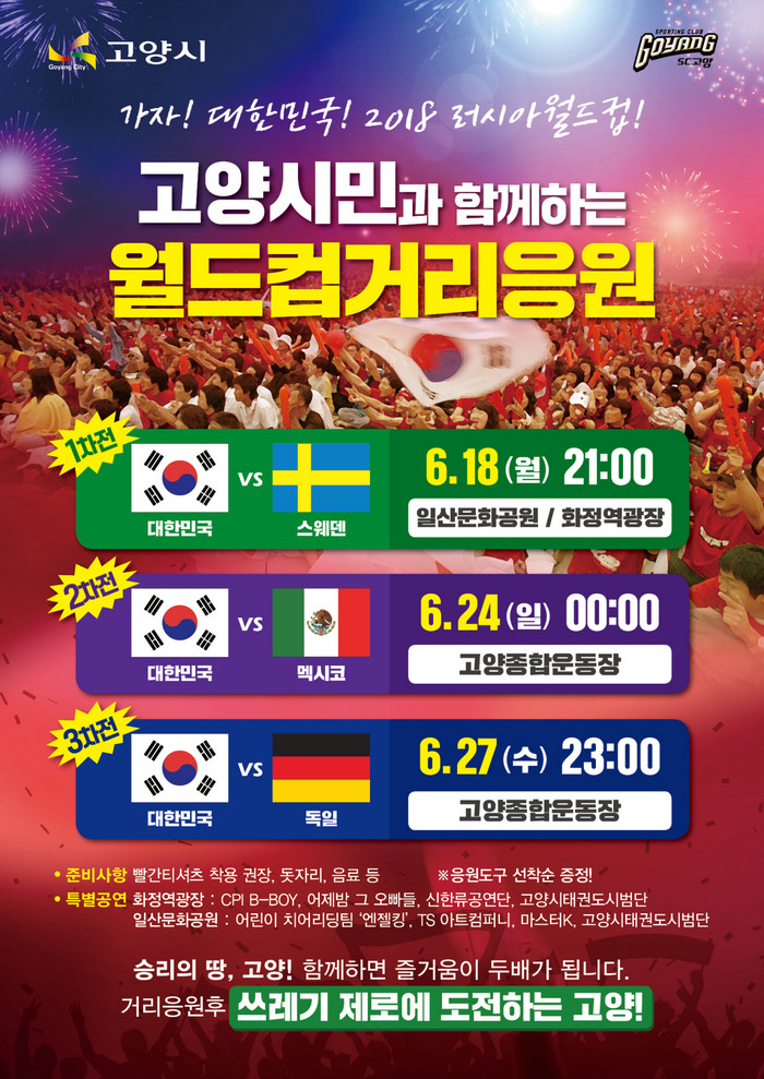 18일 예선 1차전(스웨덴전)은 덕양구 화정역 광장과 일산 문화광장 두 곳에서 열린다. 24일 예선 2차전(멕시코전)과 27일 예선 3차전(독일전)은 각각 고양종합운동장 한 곳에서 열릴 예정이다.