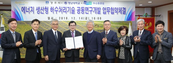 이번 협약은 경주시가 자체 개발한 GJ-R 기술과 두산중공업의 LEAOX 기술의 결합을 통해 에너지 절감형 하수처리기술 혁신과 사업화 확대를 위해 추진한다.