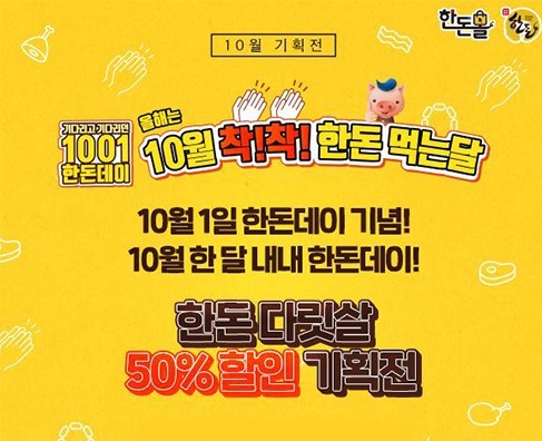 한돈자조금관리위원회(한돈자조금)는 한돈데이가 있는 10월을 '올해는 10월 착!착! 한돈 먹는 달'이라는 주제로 한돈 다릿살 50% 할인 기획전을 진행한다. 한돈 공식 온라인 쇼핑몰 한돈몰에서 진행되는 이번 기획전에서는 뒷다릿살이 포함된 한돈 세트제품 17종을 50% 할인된 가격으로 선보인다.