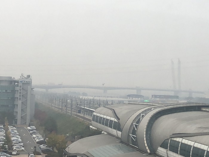 ▲6일 오후 공항철도 검암역 아라뱃길 다리가 뿌옇게 보일 정도로 시야가 좋지 않는 가운데, 시민들이 마스크를 착용하고 외출하는 모습이 많이 눈에 띄웠다. |
