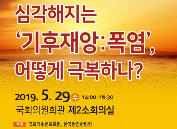 국회기후변화포럼(대표의원 홍일표·한정애)은 29일 의원회관 제2소회의실에서 '심각해지는 기후재앙 폭염, 극복’라주제로 심포지엄을 개최한다.