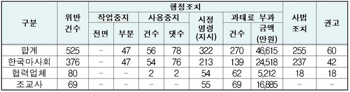 감독한 결과, 노동관계 전반에서 많은 법 위반 사항은 산업안전보건분야에서 세계 선진 수준의 경마 실시국(2016년 매출액 7조7000억원)에 걸맞지 않게 산업안전보건은 낮은 수준으로 특히 협력업체 안전관리에 소홀한 것으로 나타났다.