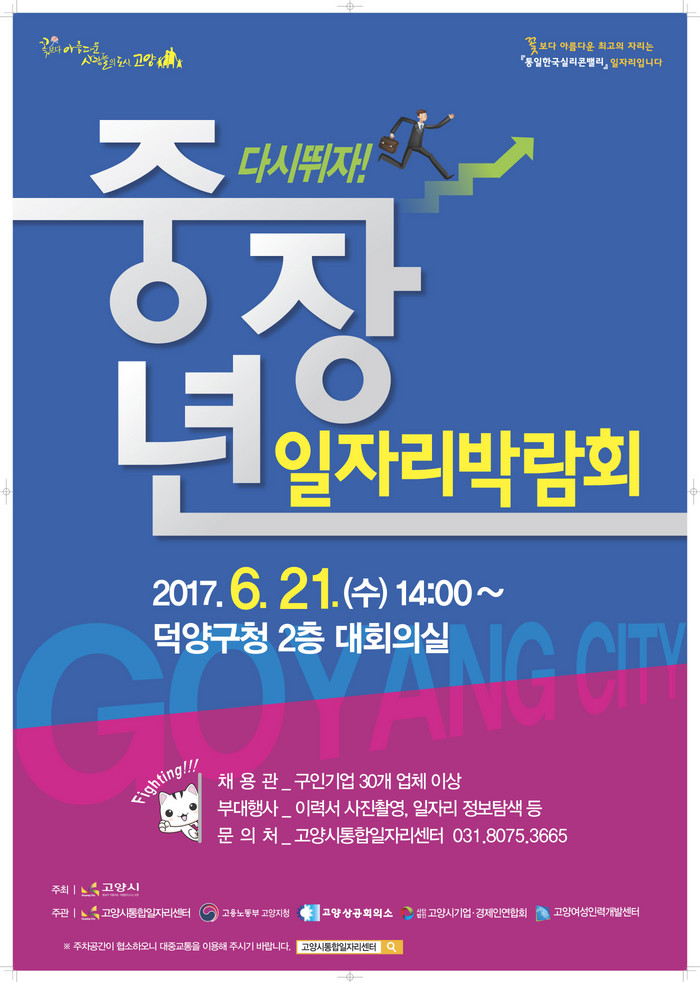 [환경데일리 이수진 기자]고양시(시장 최성)는 21일(수) 오후 2시 덕양구청 대회의실에서 '2017 중장년 일자리박람회'를 개최한다.