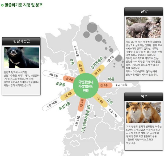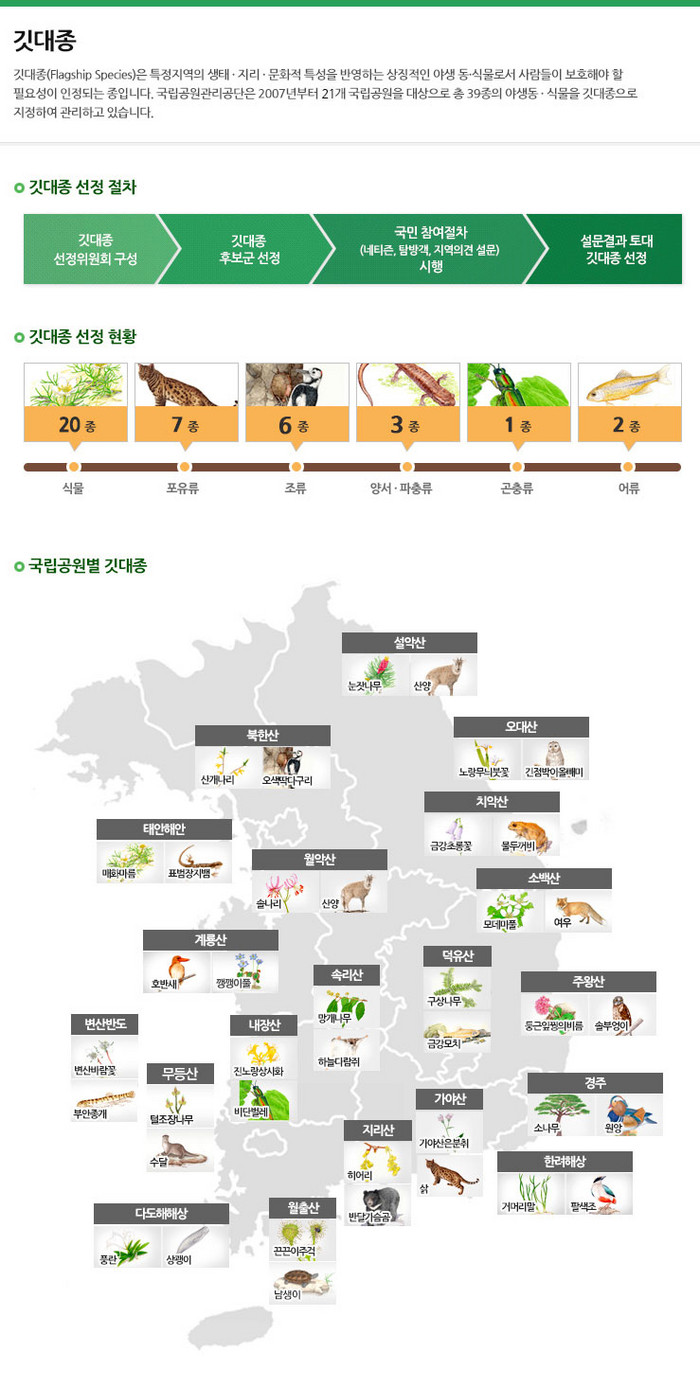 천년 고도 신라시대 등장했던 비단벌레는 내장산에 살았다. 현재 멸종위기2급이다. 하늘다람쥐는 속리산이 고향이다. 국립공원관리공단이 지정한 깃대종에 속한다. 설악산, 월악산 일대는 산양은 이미 멸종위기 1급 특급대우를 받고 있다. 일년에 한번 볼까말까 할 정도다. 지리산국립공원은 반달가슴곰이 멸종위기1급으로 한창 종복원에 심혈을 기울리고 있다.
