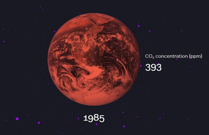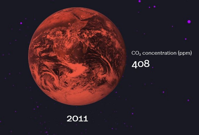 ▲지구 행성은 약 400년 동안 이산화탄소가 300배 늘었다. 이런 패턴이라면 앞으로 100년 내 지구온난화로 더 이상 사람 손으로 어 떠한 조치를 취하지 못한 채 버려지는 행성될 수 있다는 경고가 설득력 있게 다가오고 있다. |