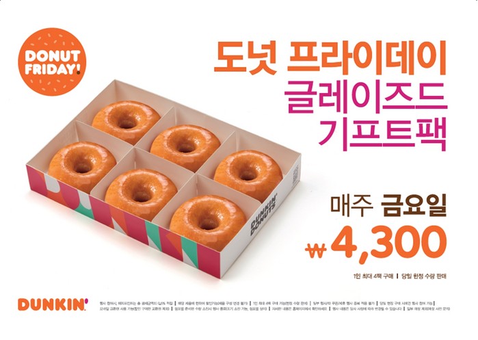 매주 금요일에 도넛 프라이데이 프로모션을 실시한다. 던킨도너츠의 인기 메뉴인 글레이즈드를 특별한 혜택가에 만나볼 수 있는 행사로, 촉촉하고 부드러운 글레이즈드 6개로 구성된 '글레이즈드 기프트 팩'을 2300원 할인된 4300원에 제공한다.