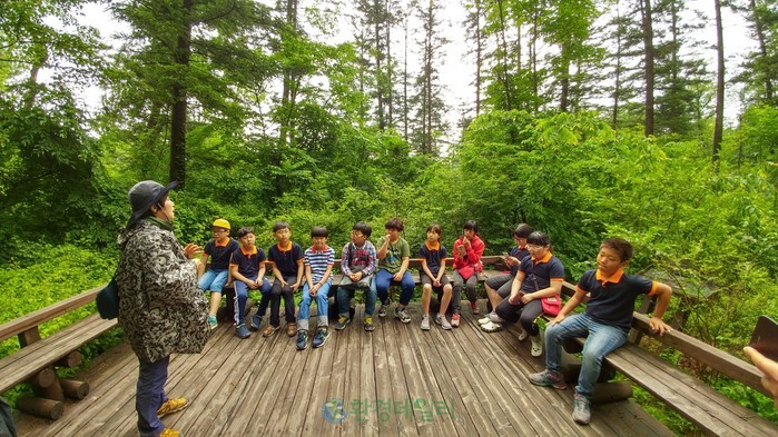 ▲도시 아이들에게 교실내 환경교육에서 벗어나 직접 숲 체험으로 자연환경의 중요성에 대한 올바른 가치관과 친환경적 생활양식을 형성할 수 있는 기틀을 마련한 산림조합중앙회는 1993년부터 '숲과의 만남' 프로그램은 2017년까지 10만명이 넘을 정도로 인기가 높다. 사진은 파주군내초등학생들이 숲해설가로부터 설명을 듣고 있다. |