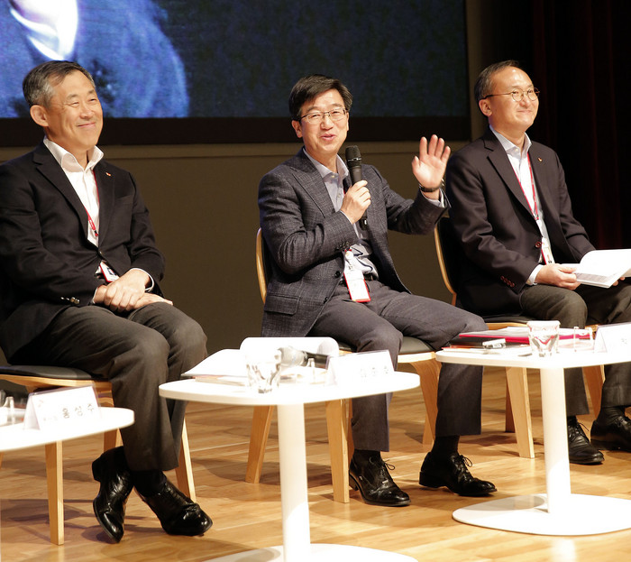 ▲SK하이닉스 박성욱 부회장이 신입사원들의 질문에 답하고 있다. 사진 왼쪽부터 경영지원총괄 김준호 사장, 대표이사 박성욱 부회장, 사업총괄 이석희 사장. |