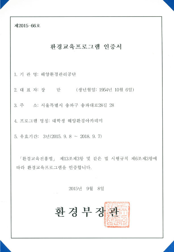 [환경데일리 윤경환 기자] 해양환경관리공단(KOEM, 이사장 장만)은 환경부로부터 환경교육 프로그램 인증을 획득했다.